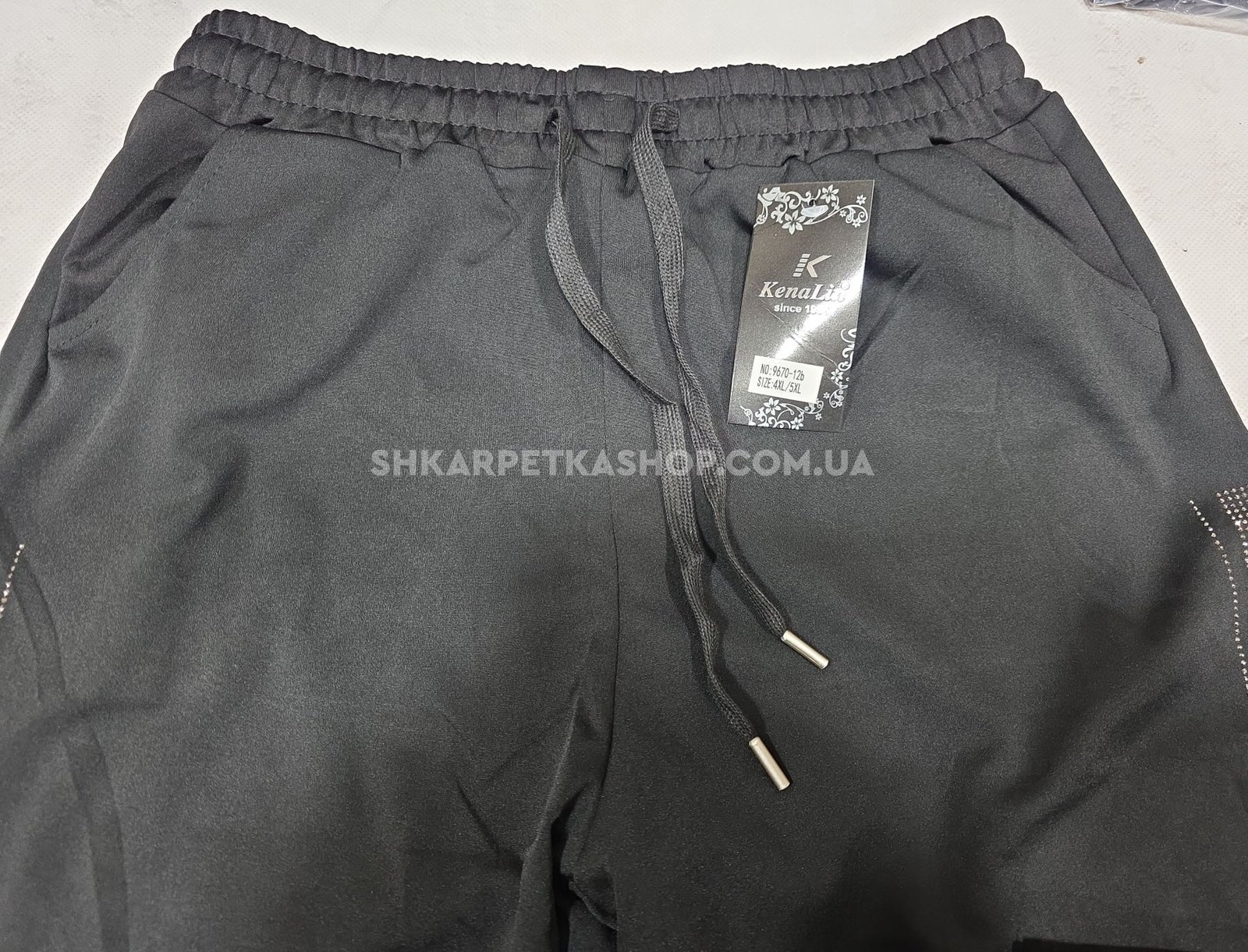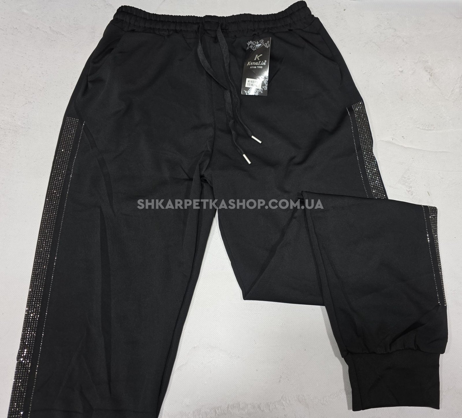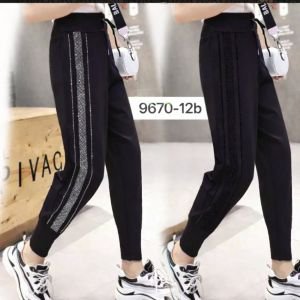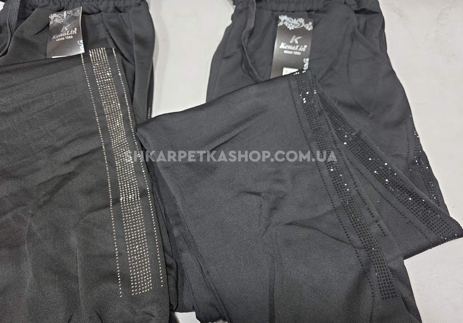 Прогулянкові штани "Kenalin" 9670-12b батал, низ на широкому манжеті +верх на резинці +з боків широкі лампаси з камінчиків +кишені, р. 5XL/6XL-(52-54), 6XL/7XL-(54-56) -(чорні -без вибору кольору камінчик!)