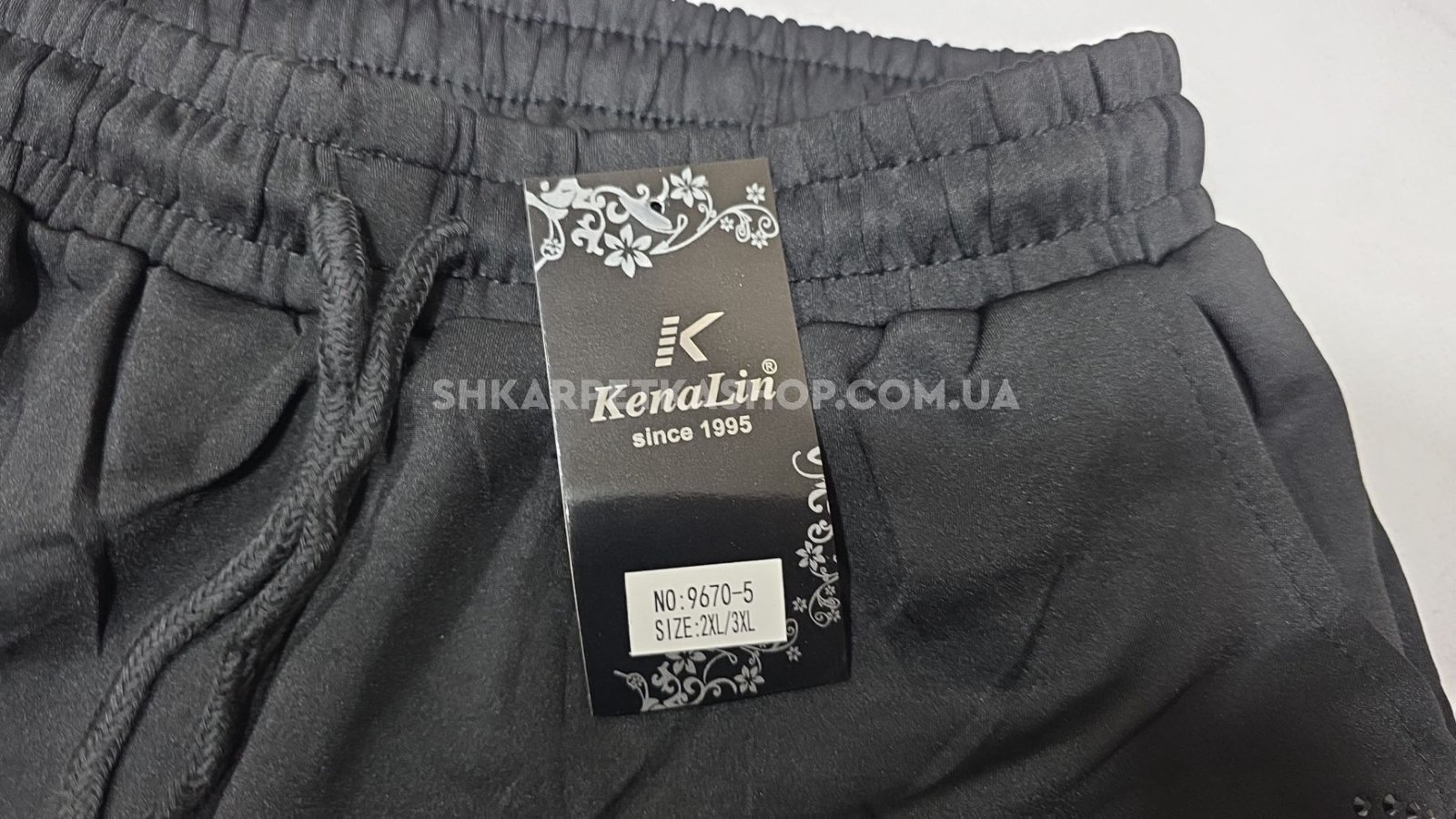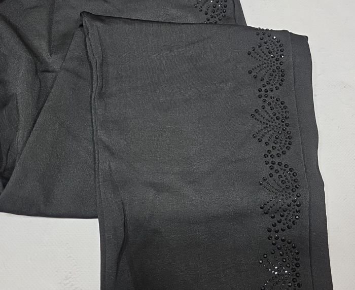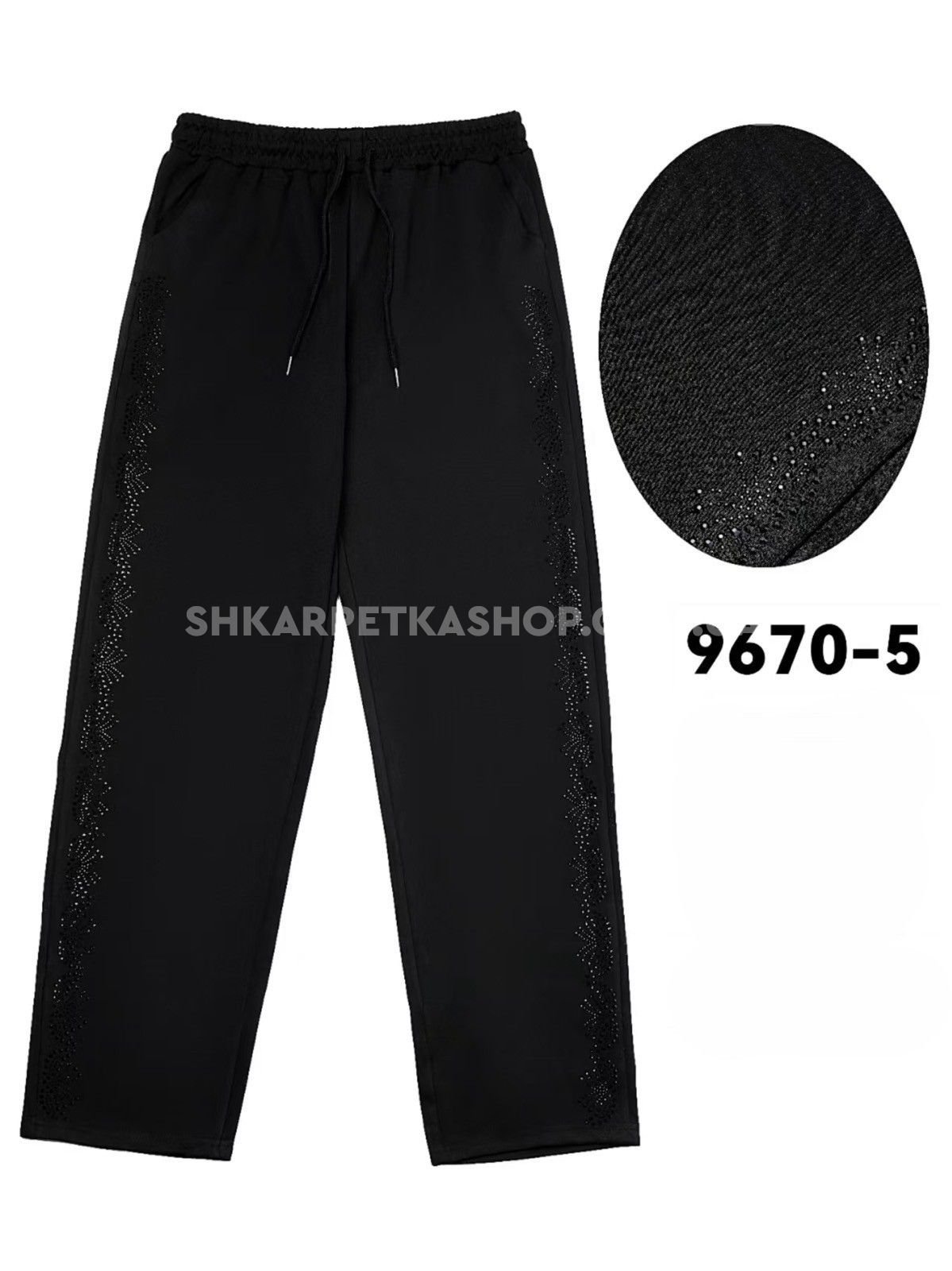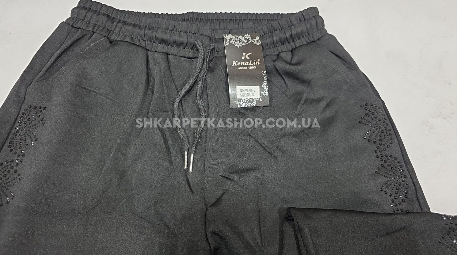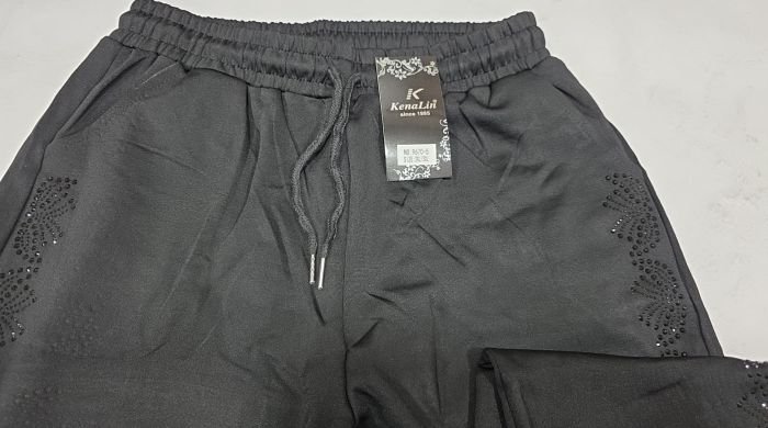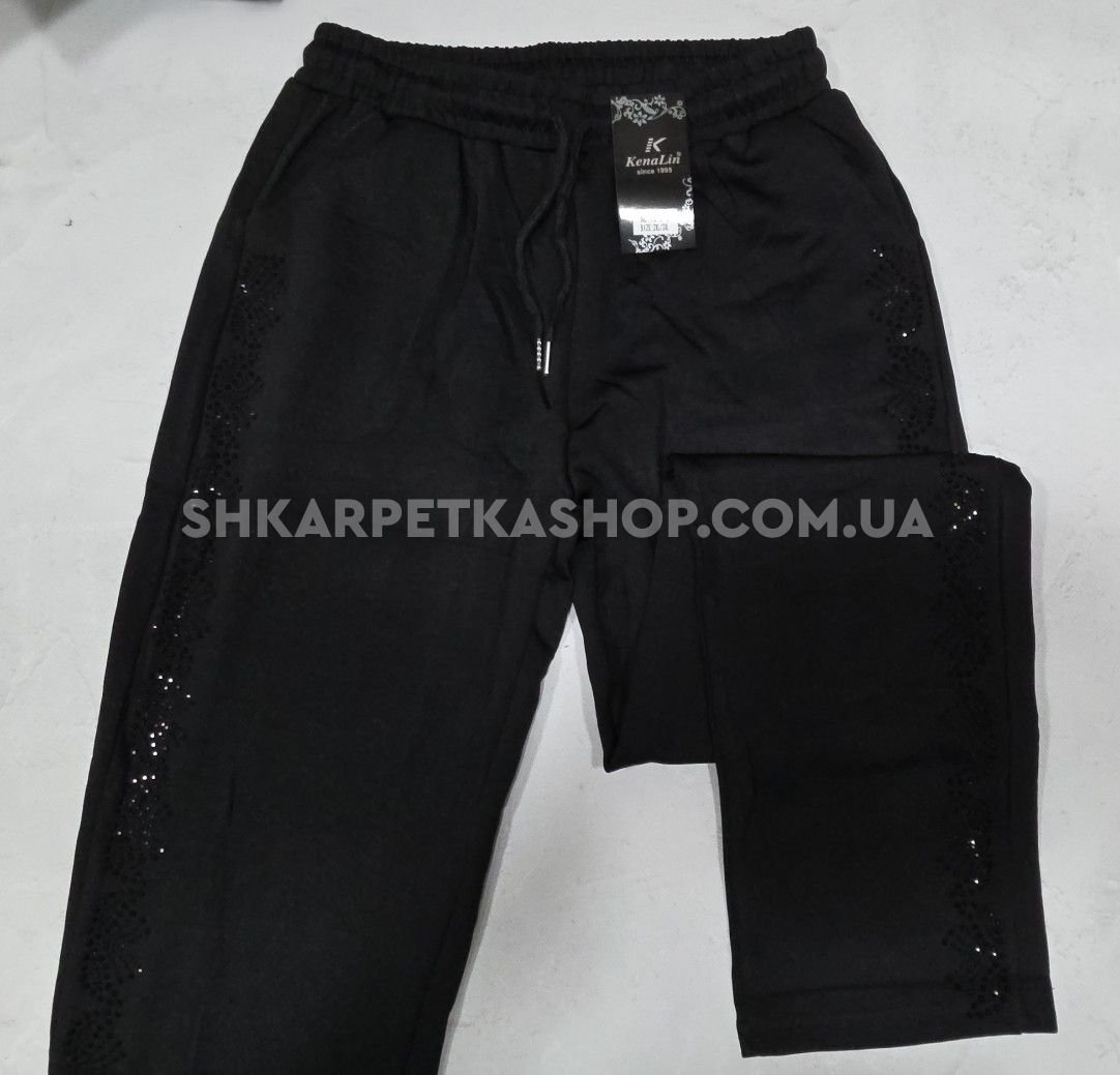 Прогулянкові штани "KENALIN" 9670-5 з прямим низом, верх на резинці +з боків у довжину візерунок з чорних камінчиків +спереду з боків кишені, р. 2XL/3XL-(46-50), 3XL/4XL-(48-52), 4XL/5XL-(50-54), 5XL/6XL-(52-56) -(чорні) -уп. 1 шт