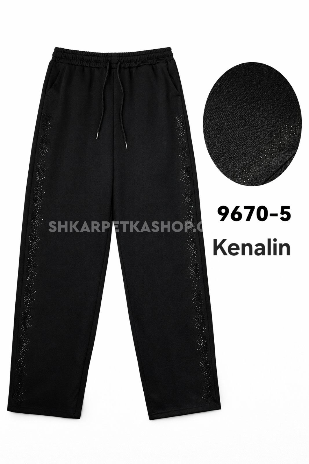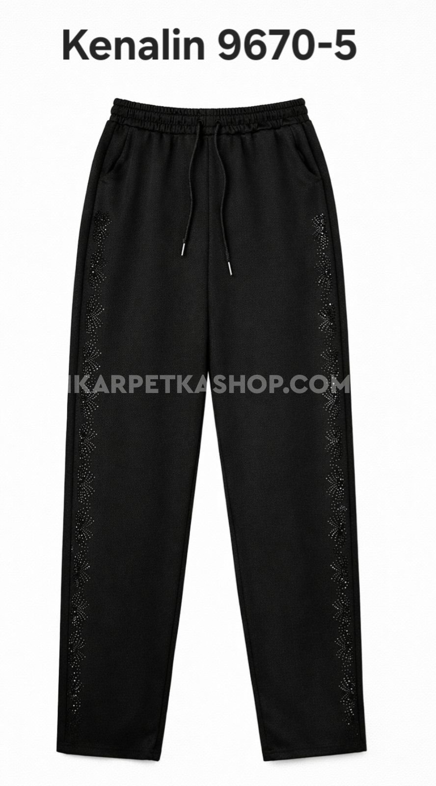 Лосини брючні "KENALIN" 9670-5 з прямим низом, верх на резинці +з боків у довжину візерунок з чорних камінчиків +спереду з боків кишені, р. 2XL/3XL-(46-50), 3XL/4XL-(48-52), 4XL/5XL-(50-54), 5XL/6XL-(52-56) -(чорні) -уп. 1 шт
