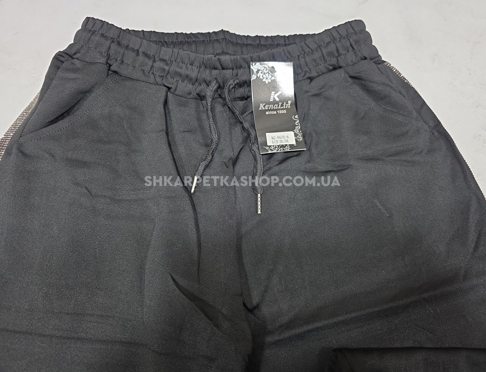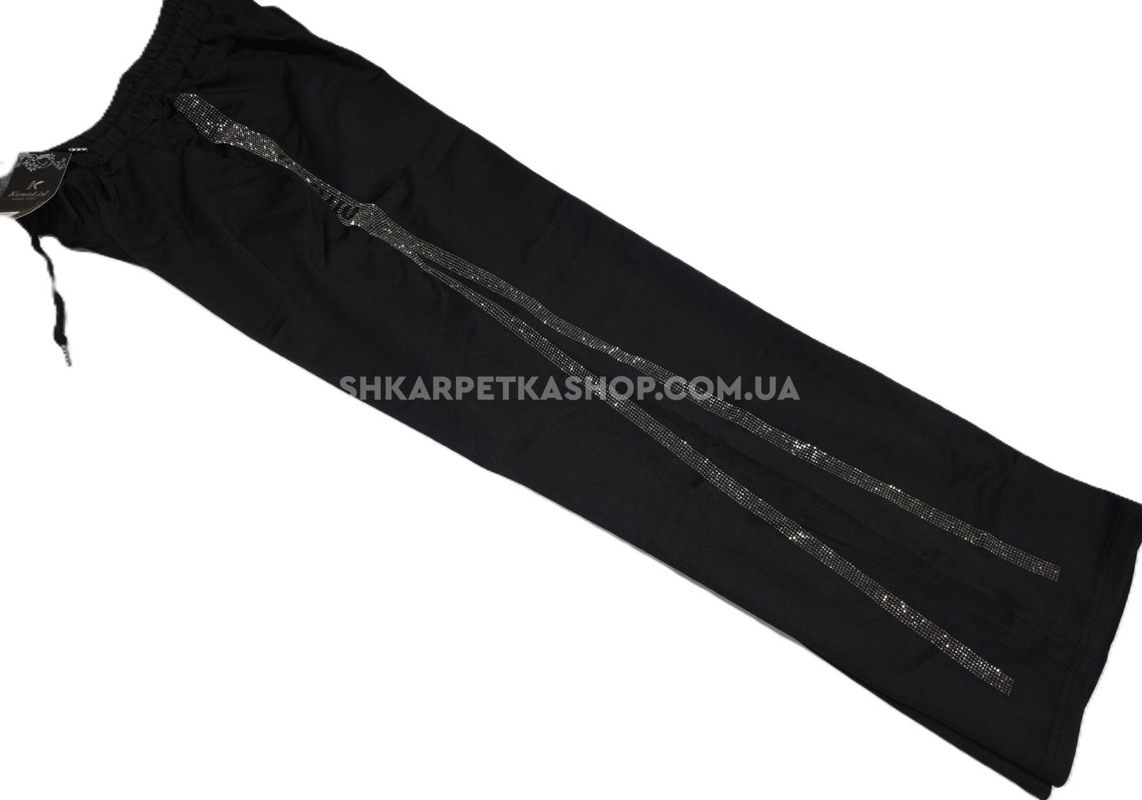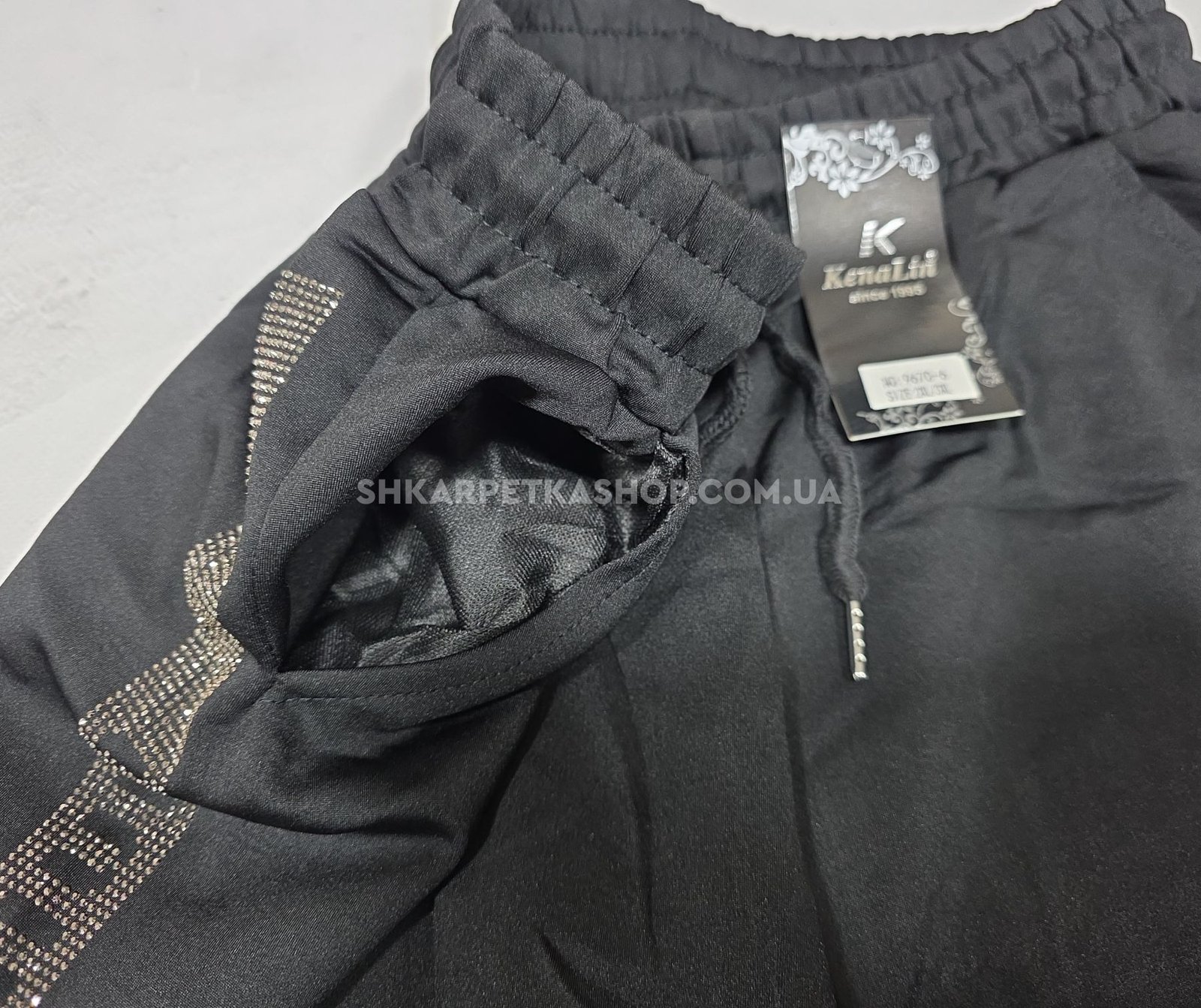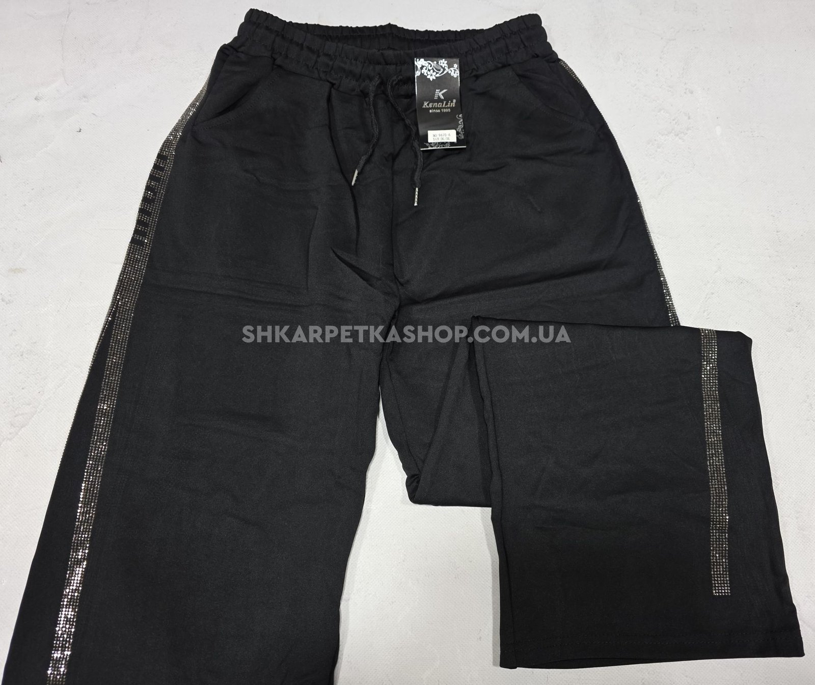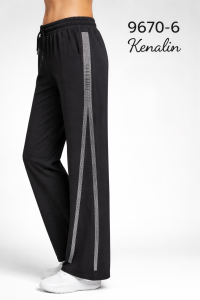 Прогулянкові штани "KENALIN" 9670-6 з широким низом, верх на резинці +з боків лампаси з камінчиків +спереду з боків кишені, р. 2XL/3XL-(46-50), 3XL/4XL-(48-52), 4XL/5XL-(50-54), 5XL/6XL-(52-56) -(чорні) -уп. 1 шт