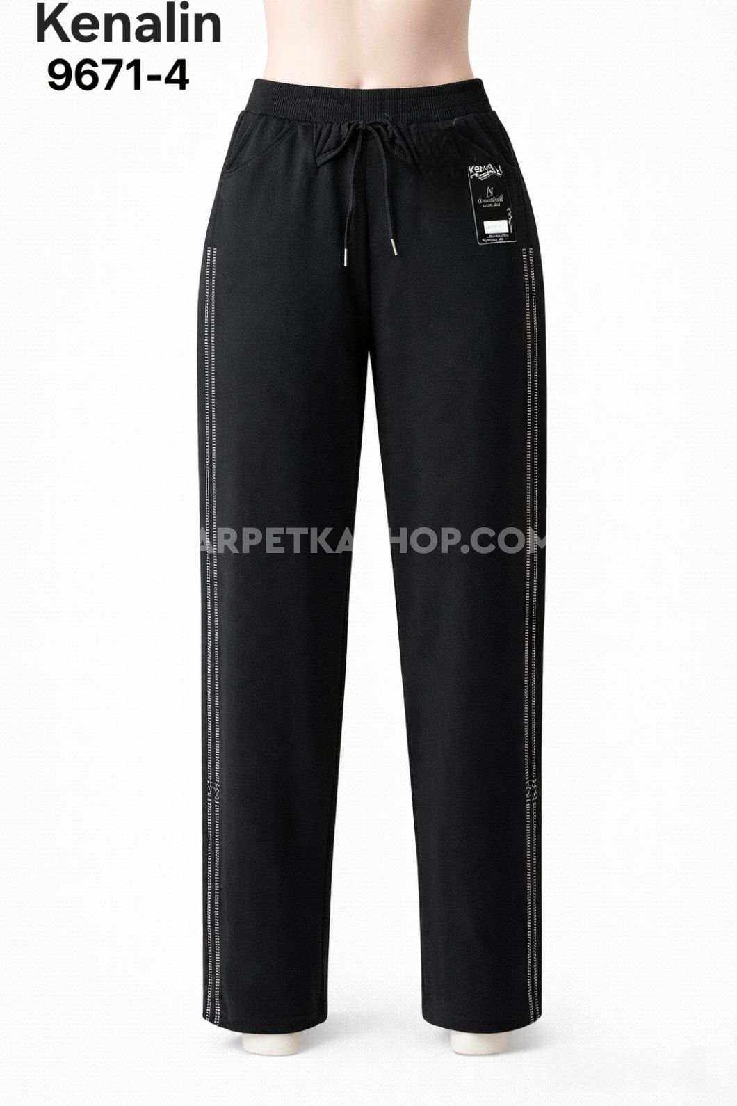 Прогулянкові штани "Kenalin" 9671-4 з прямим низом+з боків з камінчиків лампаси з тонких смужок та літерою спереду +з боків кишені, р. 2XL/3XL-(46-50), 3XL/4XL-(48-52), 4XL/5XL-(50-54), 5XL/6XL-(52-56) -(чорні) -уп. 1 шт