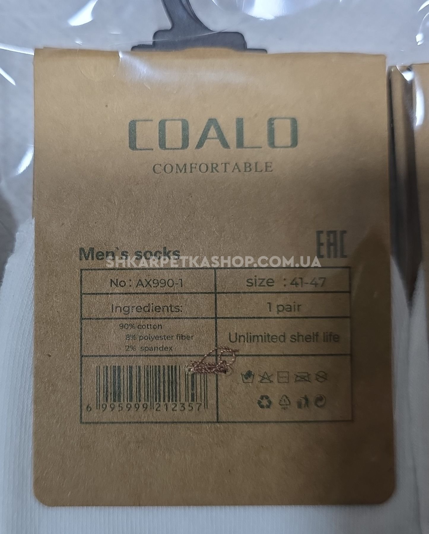 Шкарпетки "COALO" AX-990-1 стрейч /cotton чоловічі, р. 41-47 -(Короткі /білі -чол.) -уп. 10 шт