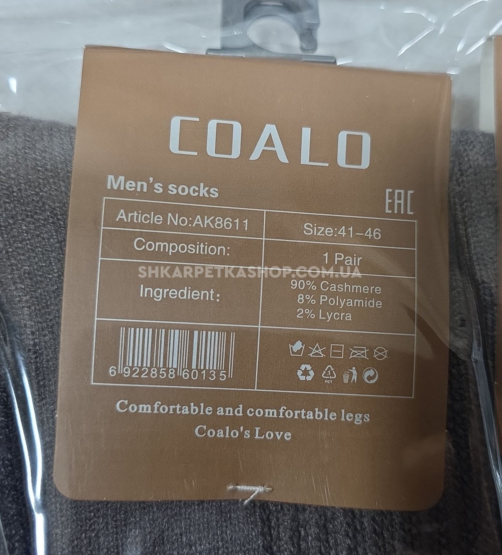 Шкарпетки "Coalo socks" АК-8611 кашемір чоловічі, р. 41-46 -асорті -(Однотонні у в'язаний рубчик) -уп. 10 шт
