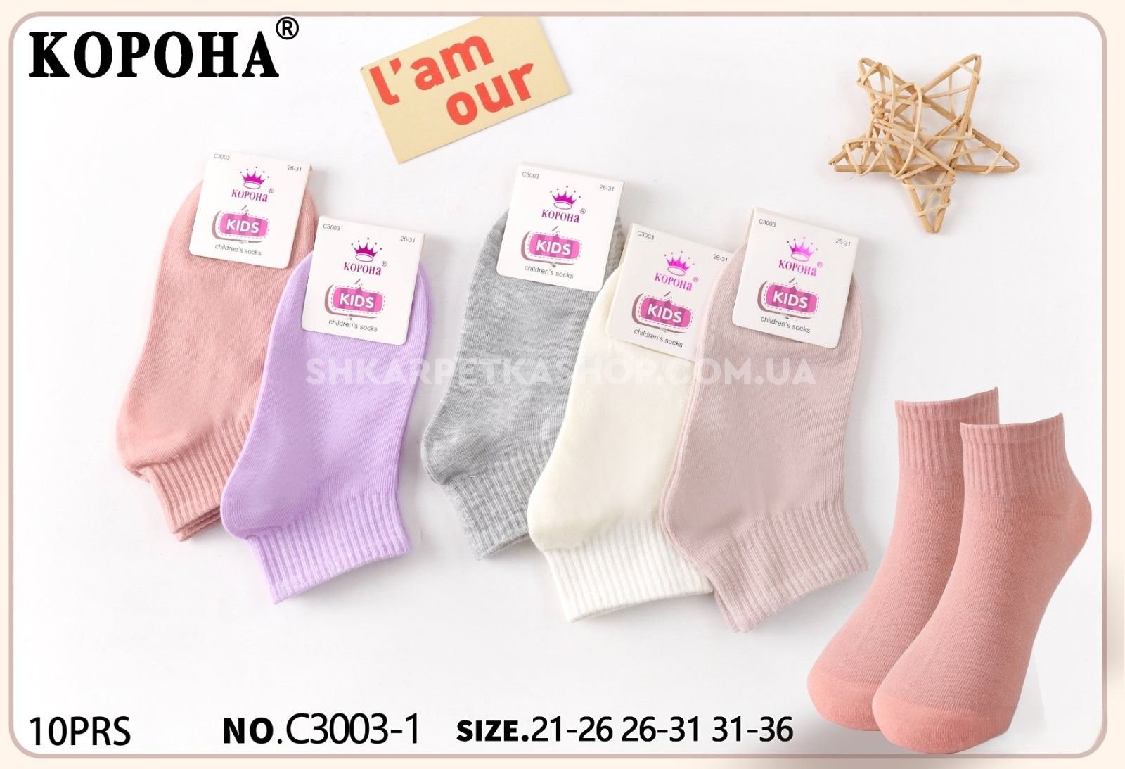 Шкарпетки "Корона" C-3003-1 стрейч дитячі на розмір взуття: 21-26, 26-31, 31-36 -асорті -(Дівчинка/ укорочені -однотонні +з широкою гумкою в рубчик) -уп. 10 шт