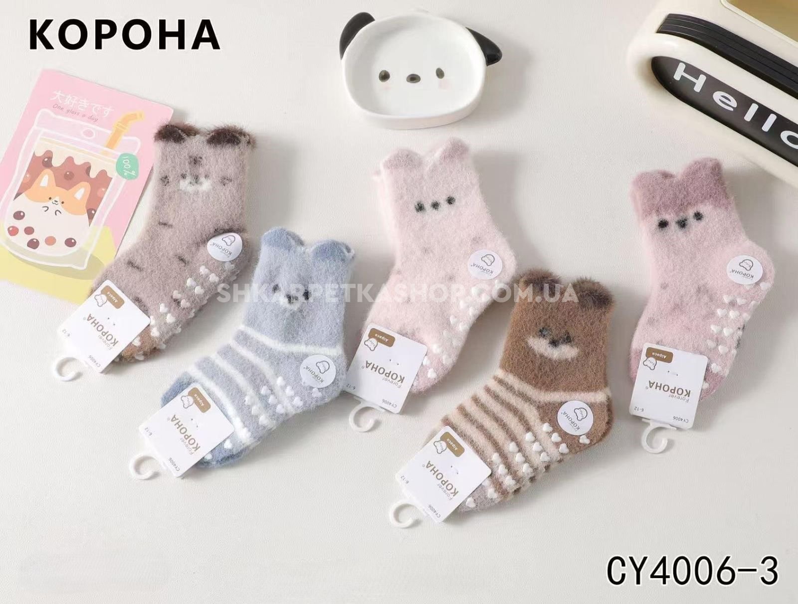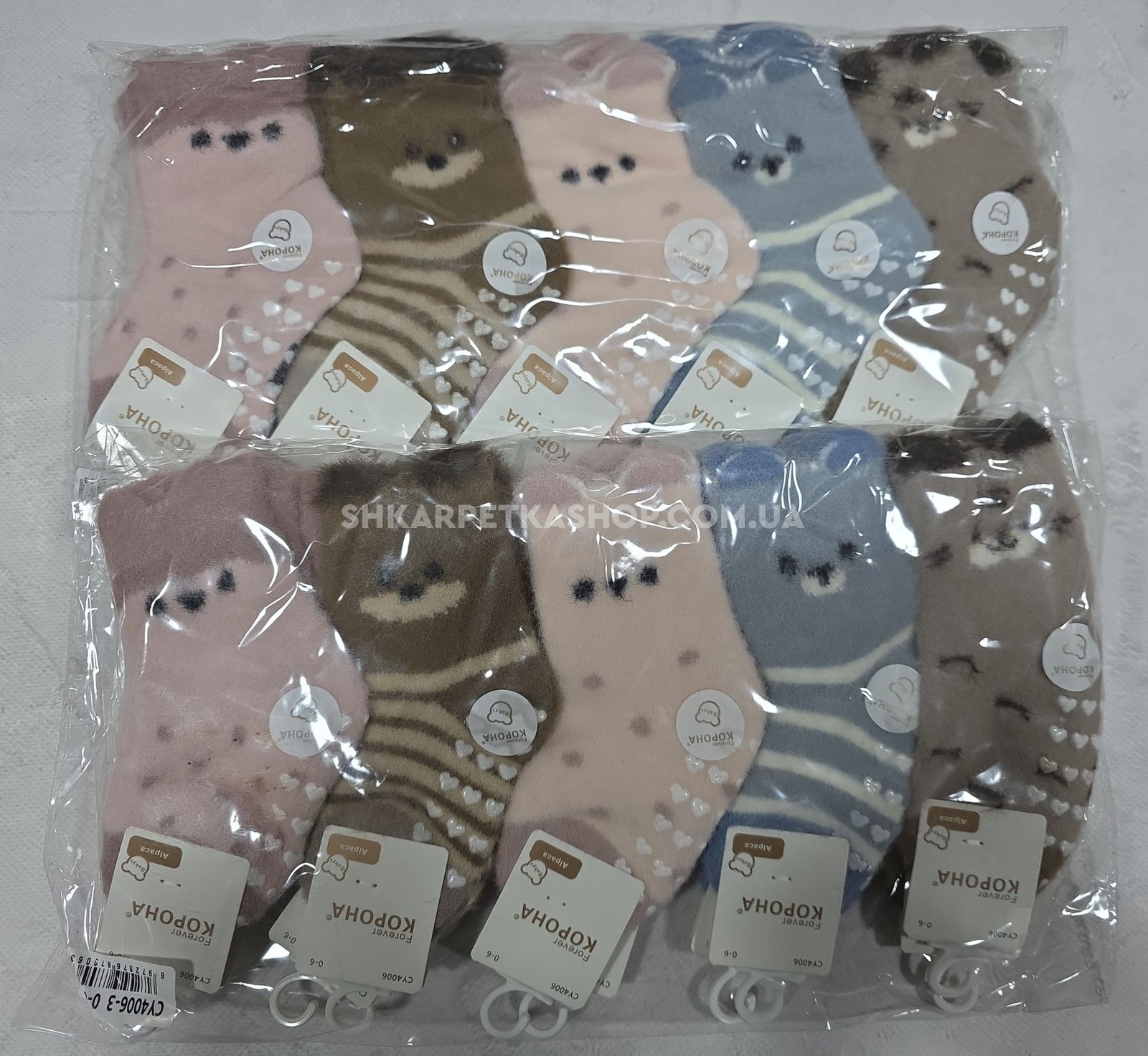 Шкарпетки "КОРОНА" CY-4006-3 альпака вовна дитячі, р. 0-6м /8-10 см, 6-12м /10-12 см -асорті -("Бебіки" -під гумкою з вушками мордочка ведмедика +смужки +на стопі силіконові гальма) -уп. 10 шт