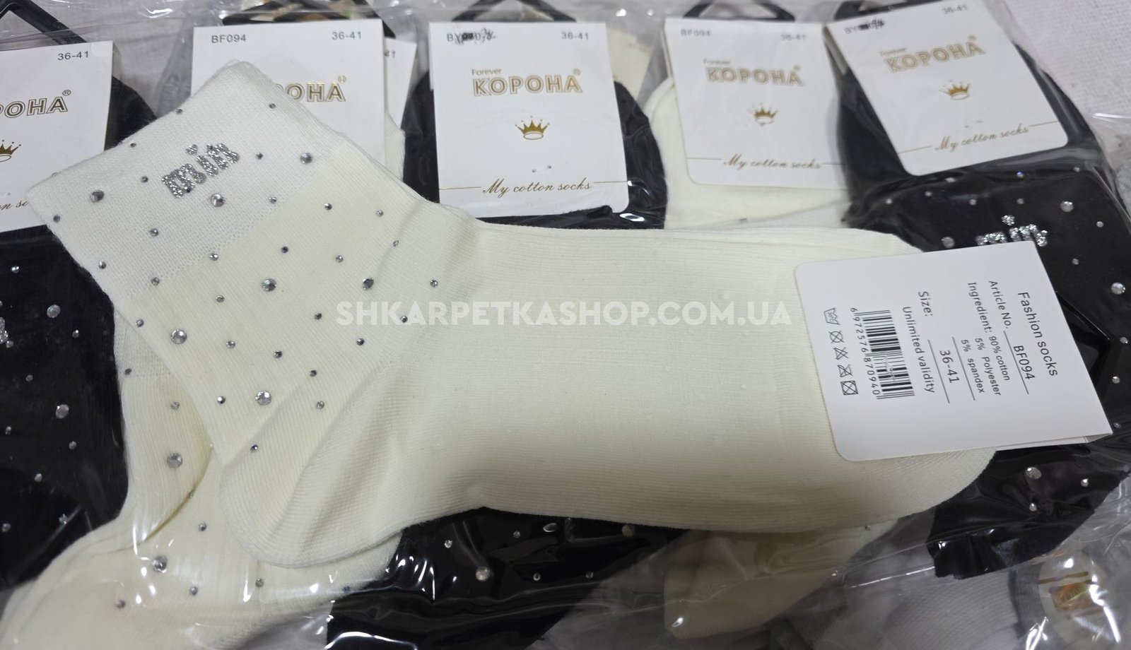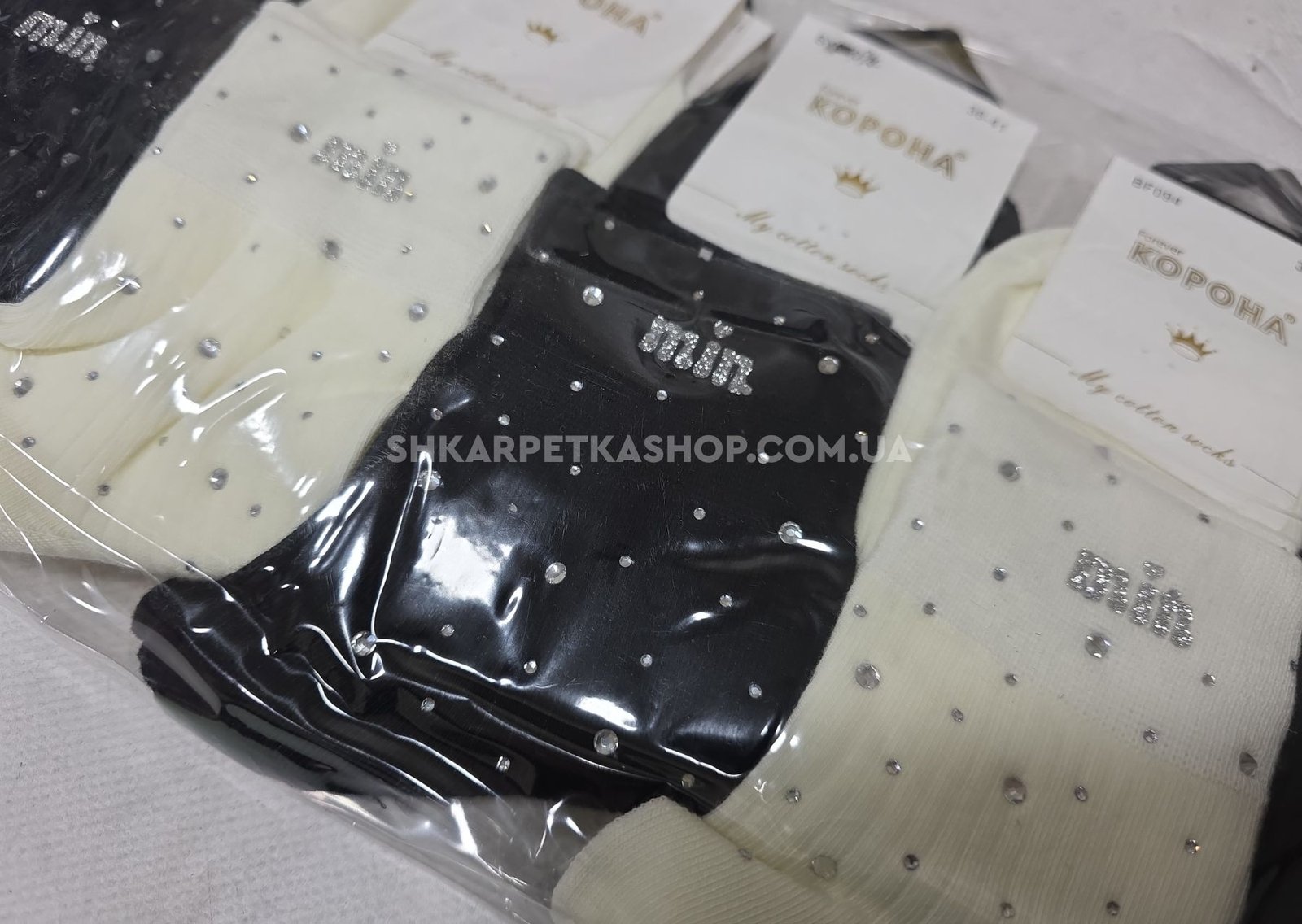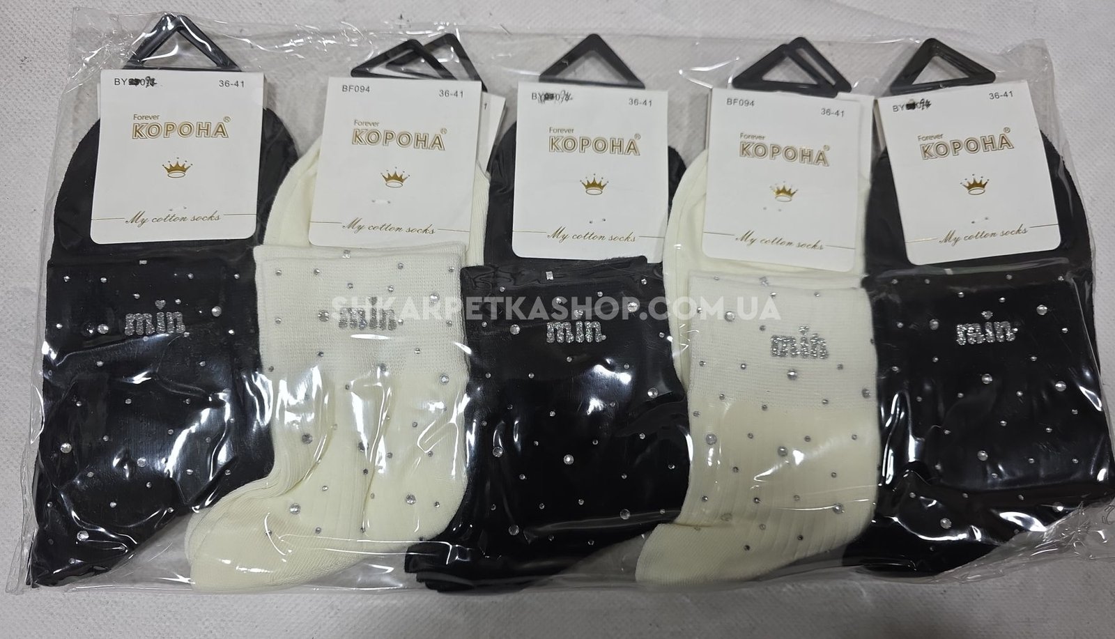 Шкарпетки "Корона" ВF-094 -(BY-950-3) стрейч/ cotton жіночі, р. 36-41 -асорті -(Середні /однотонні в рубчик +на гумці камінці та напис "min") -уп. 10 шт