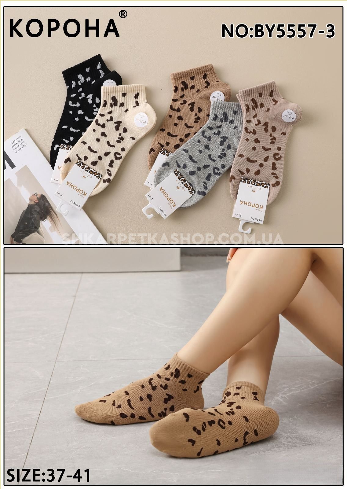 Шкарпетки "Корона" ВY-5557-3 стрейч/cotton жіночі, р. 37-41 -(Укорочені з леопардовими цятками по всій шкарпетці та гумці в рубчик) -уп. 10 шт
