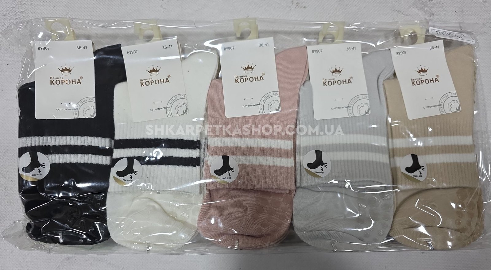 Шкарпетки "Корона" ВY-907-1 стрейч /cotton з гальмами на стопі жіночі, р. 36-41 -асорті -(Однотонні + на широкій гумці в рубчик дві смужки +гальма на стопі) -уп. 10 шт