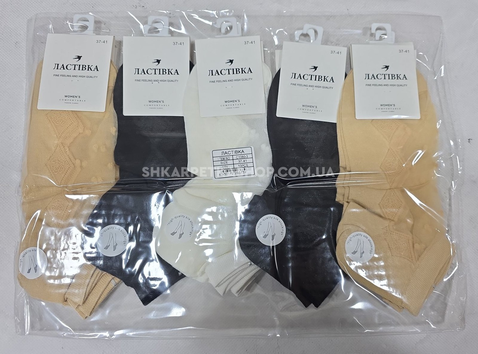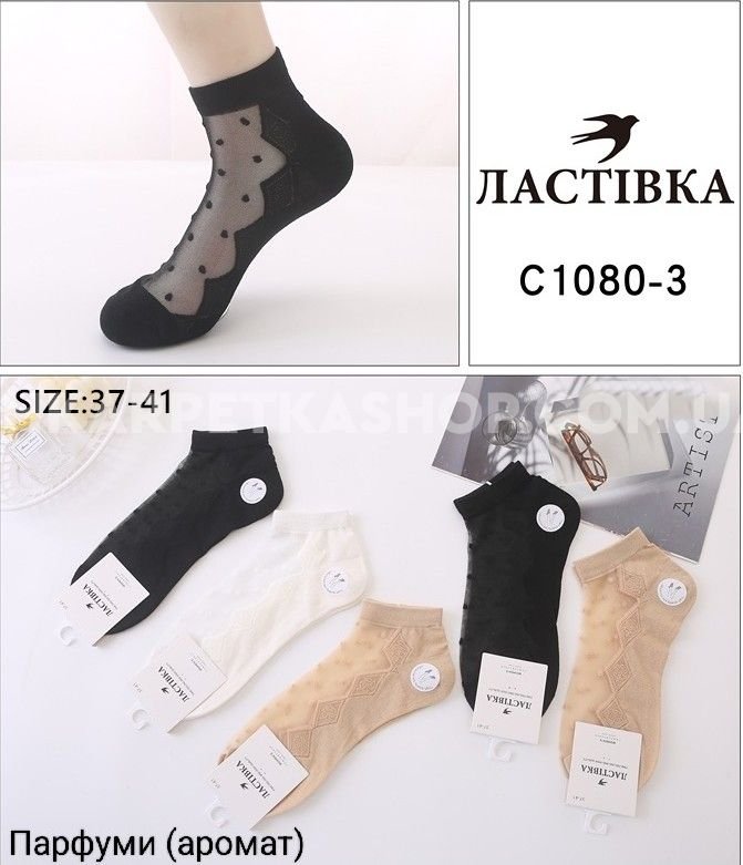 Шкарпетки "Ластівка" С-1080-3 nylon+cotton жіночі, р. 37-41 -асорті -(укорочені з нейлоновим верхом у горошок +бавовняна підошва +збоків візерунок з ромбів) -уп. 10 шт