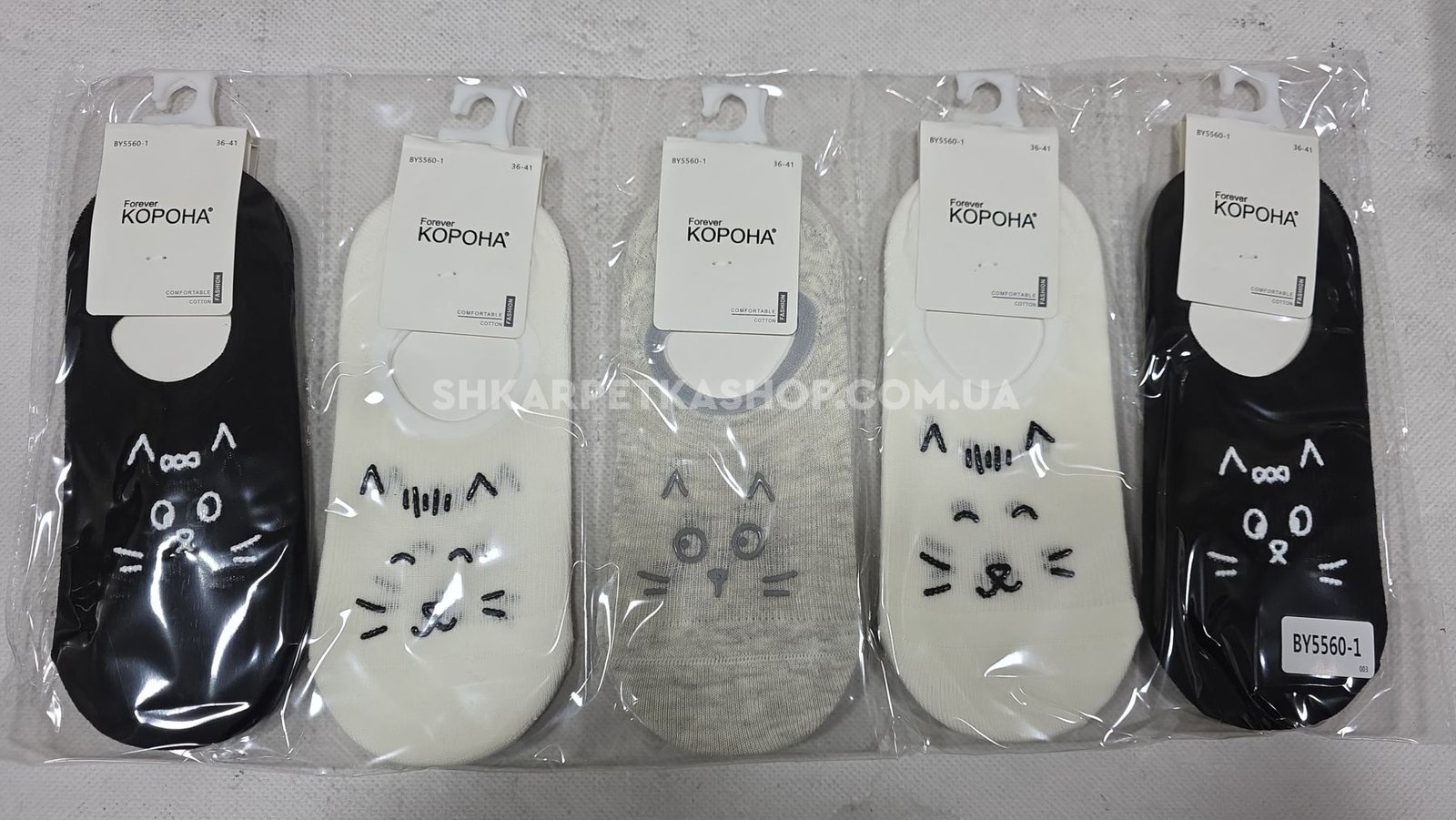 Шкарпетки-сліди "Корона" BY-5560-1 стрейч/ cotton жіночі із силіконом на п'яті, р. 36-41 -асорті -(Сліди /однотонні -спереду в дрібний рубчик +мордочка котика) -уп. 10 шт
