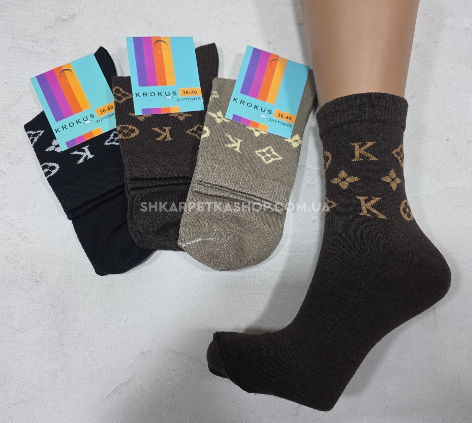 Шкарпетки Житомир "Krokus" 776 економ /стрейч жіночі, р. 36-40 -асорті -("економ" високі /коричневий мікс +під гумкою візерунок з літер "К" та значків) -уп. 12 шт