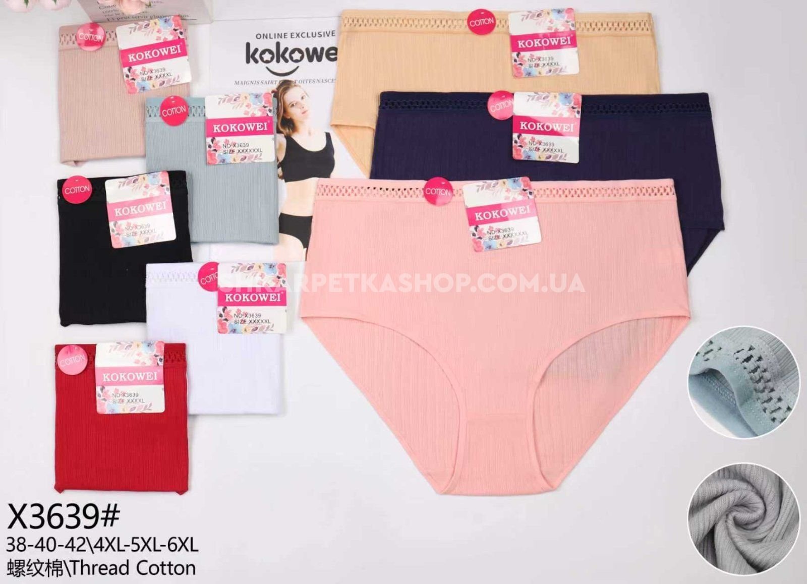 Жіночі труси "Kokowei" 3639 cotton, р. 4ХL, 5xl, 6xl -(54-56, 56-58, 58-60) -асорті -(однотонні в рубчик +тонка гумка з візерунком з сіточки) -уп. 12 шт