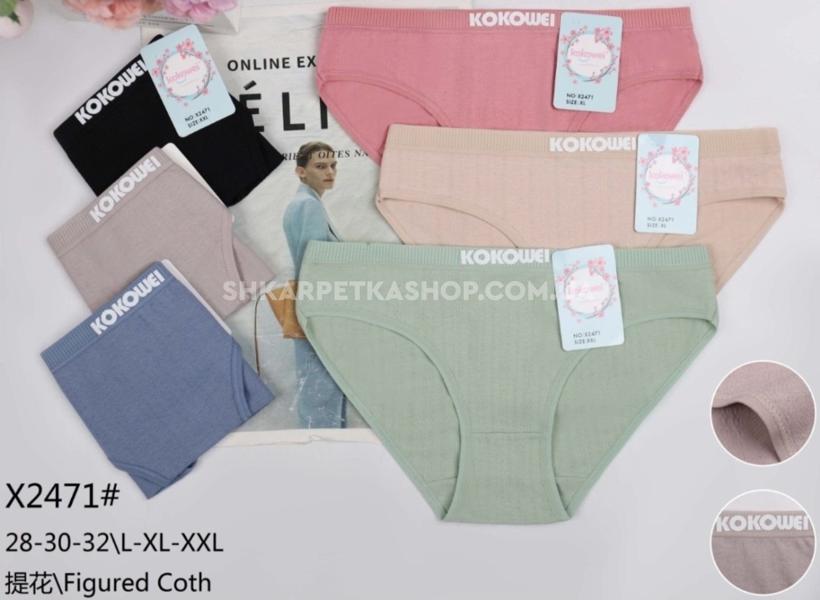 Жіночі труси "Kokowei" Х-2471 cotton, р. L, xl, 2xl -(42, 44, 46) -асорті -(Однотонні в рельєфний візерунок на резинці в рельєфний рубчик напис Kokowei) -уп. 12 шт