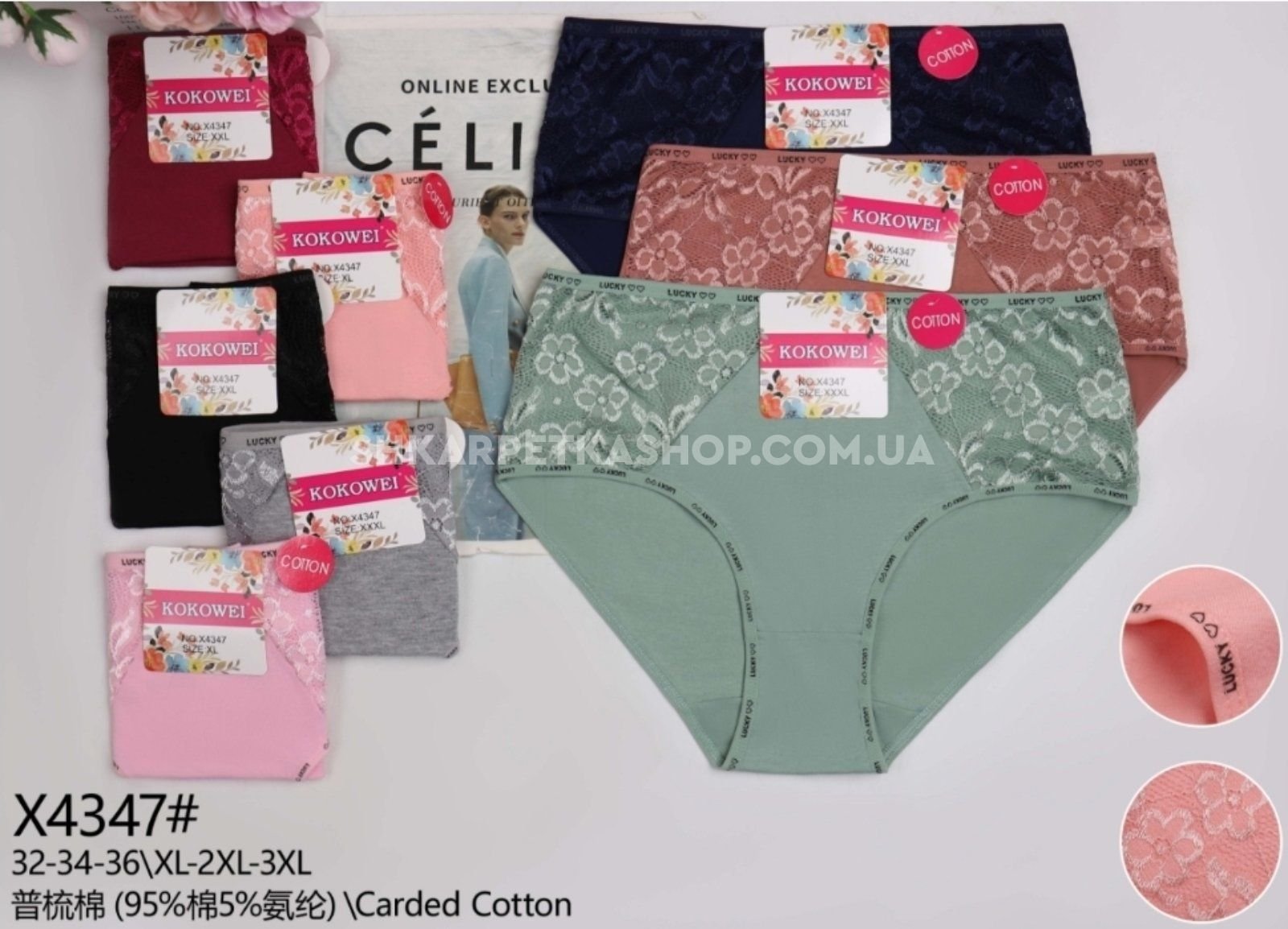 Жіночі труси "Kokowei" New Х-4347 cotton, р. ХL, 2XL, 3XL -(48, 50, 52) -асорті -(Однотонні в рубчик з мереживом) -уп. 12 шт