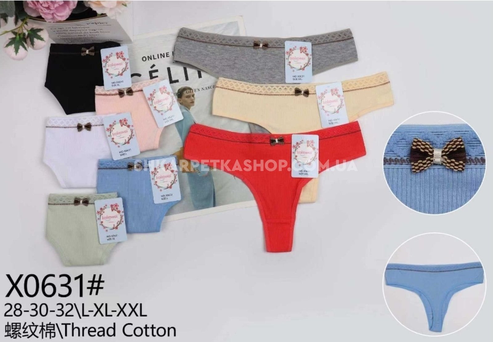 Жіночі труси /стрінги "Kokowei" New х-0631 cotton, р. М, L, XL -(44, 46, 48) -асорті -(Однотонні в рубчик) -уп. 12 шт