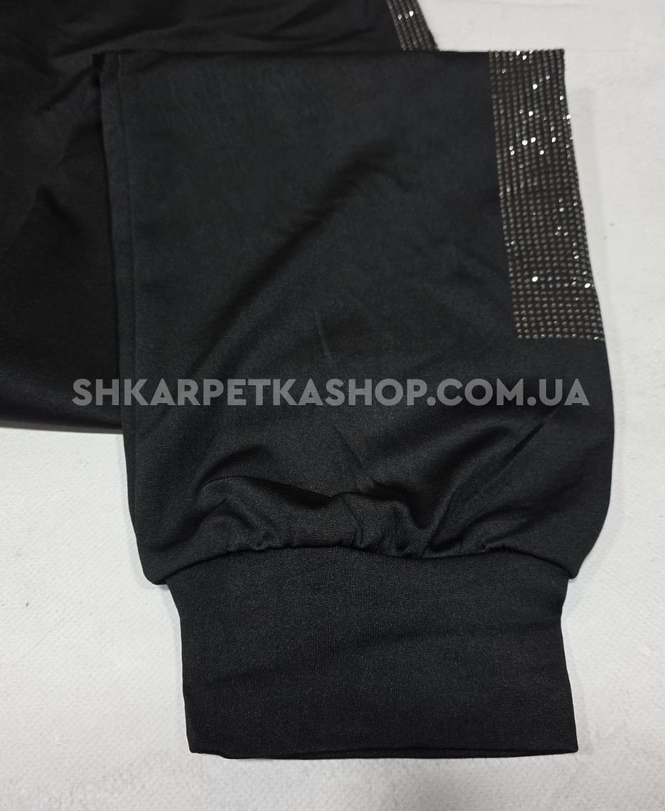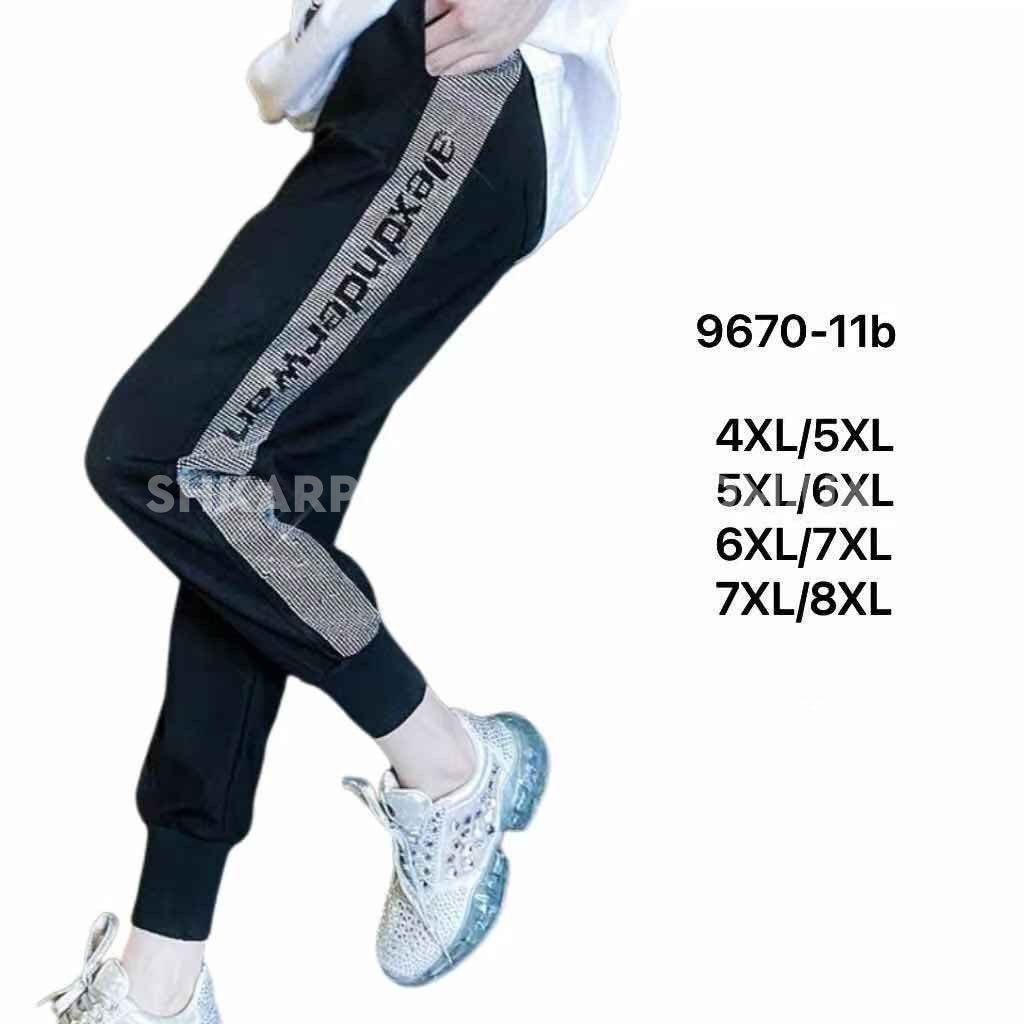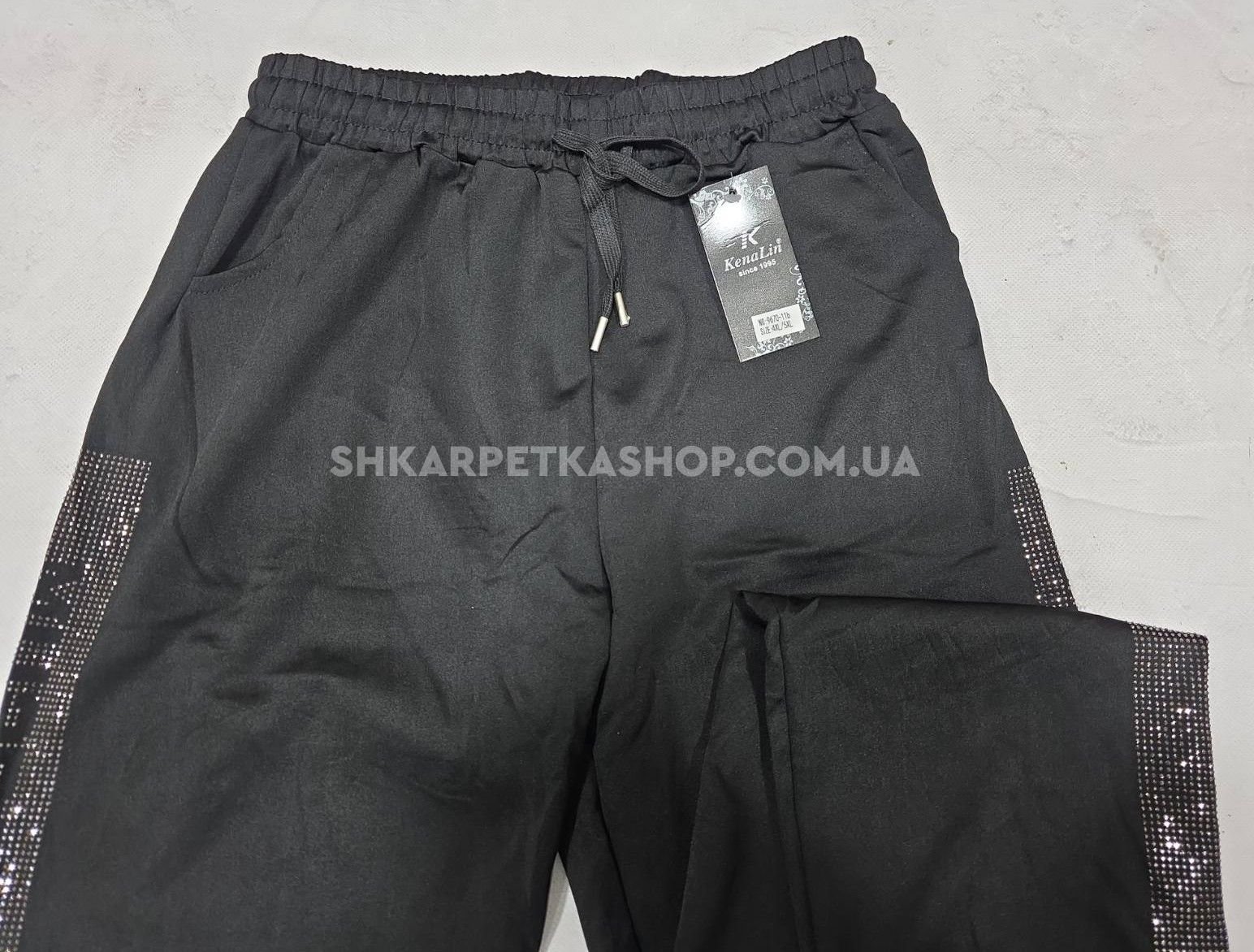 Прогулянкові штани "Kenalin" 9670-11b /1b батал, низ на широкому манжеті +верх на резинці +з боків широкі лампаси з камінчиків та написом +кишені, р. 5XL/6XL-(52-54), 6XL/7XL-(54-56) -(чорні)