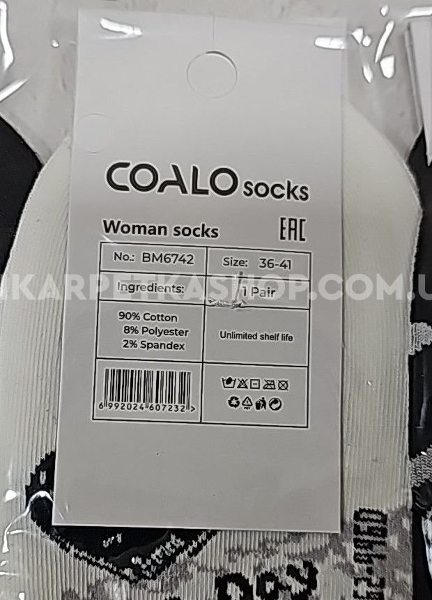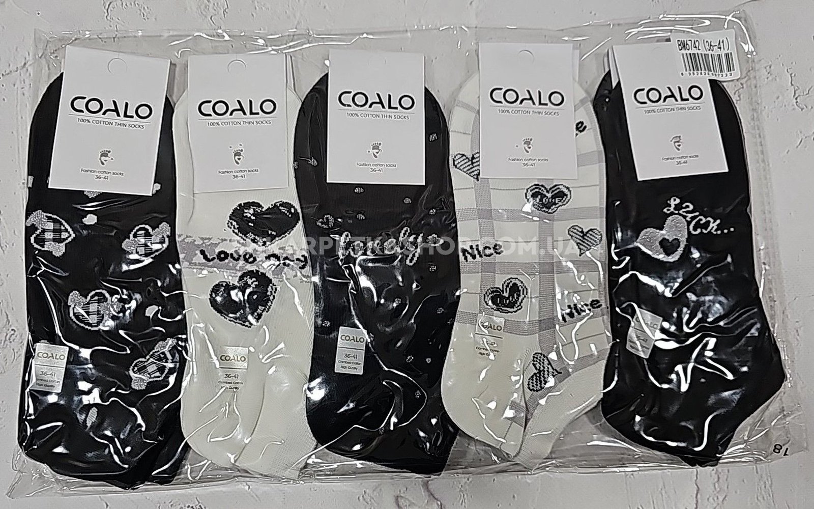 Шкарпетки "COALO" BМ-6742 стрейч /cotton жіночі, р. 36-41 -(короткі /чорні та білі в різні серця +написи +горошки +клітини) - уп. 10 шт