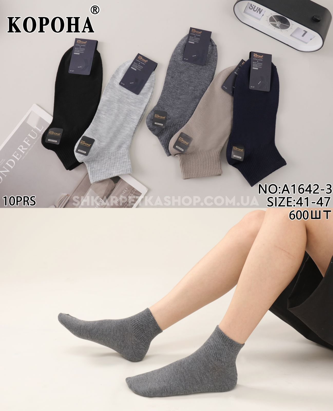 Шкарпетки "Корона" A-1642-3 стрейч/ cotton чоловічі, р. 41-47 -(Укорочені /однотонні +гумка в рубчик) -уп. 10 шт