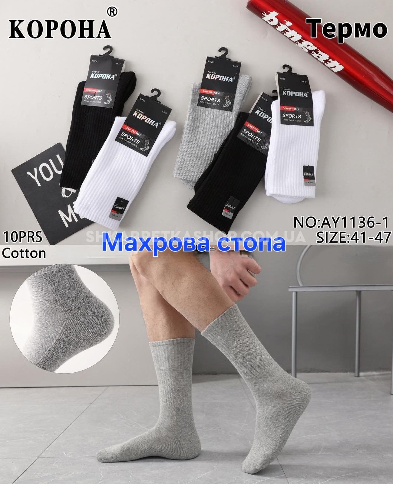 Шкарпетки "Корона" АY-1136-1 термо напівмахрові /махрова стопа чоловічі, р. 41-47 -асорті -(Теніс термо/однотонні +з високою гумкою в рубчик +махрова підошва /стопа -чол.) -уп. 10 шт.