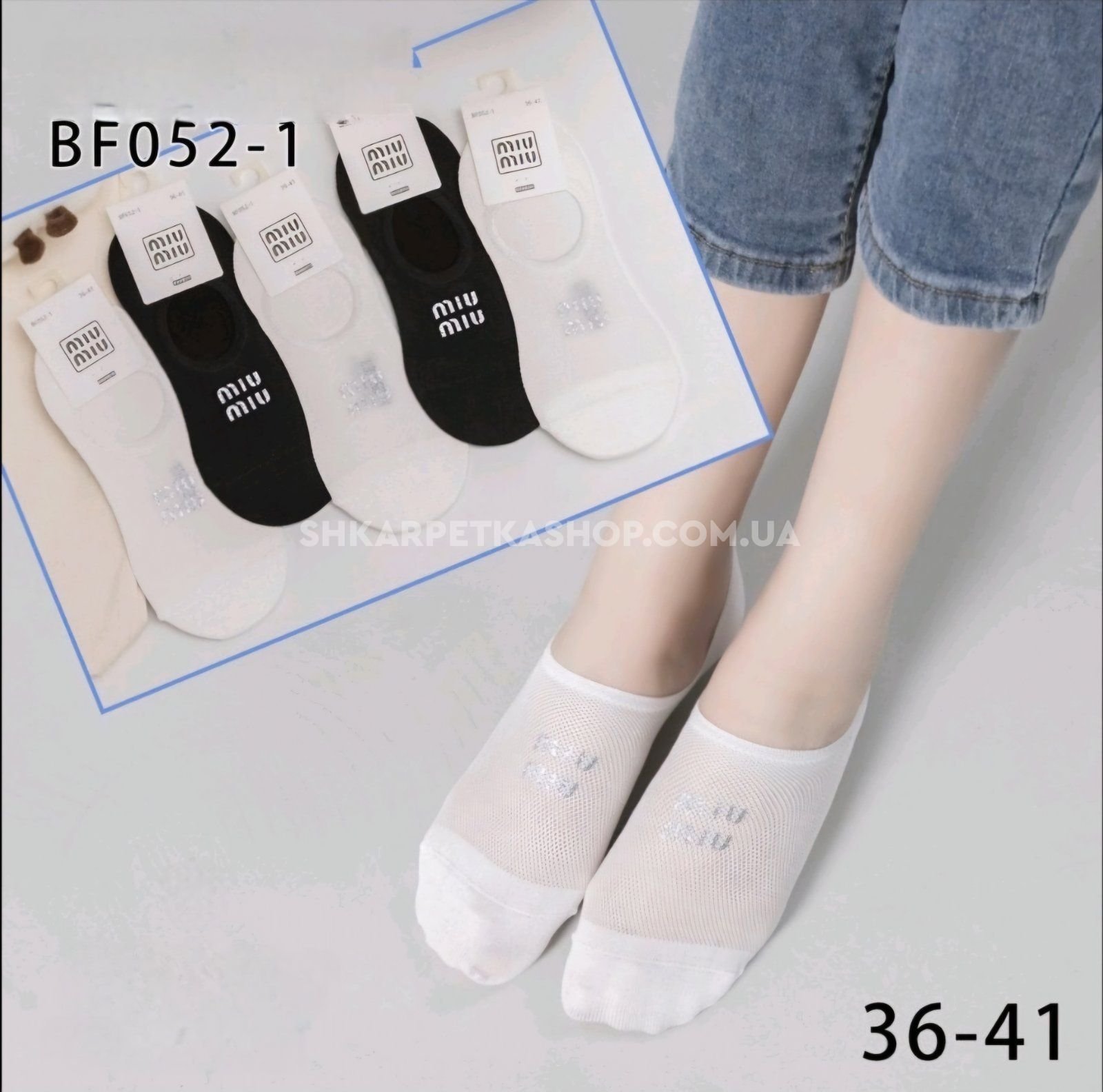 Шкарпетки-сліди "Корона /miu.." ВF-052-1 сітка із силіконом на п'яті жіночі, р. 36-41 -асорті -(Сіточка /чорні та білі +спереду сріблястий напис miu...) -уп. 10 шт