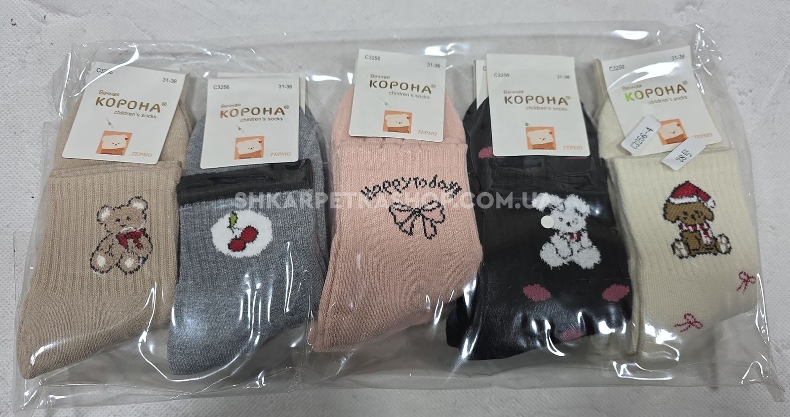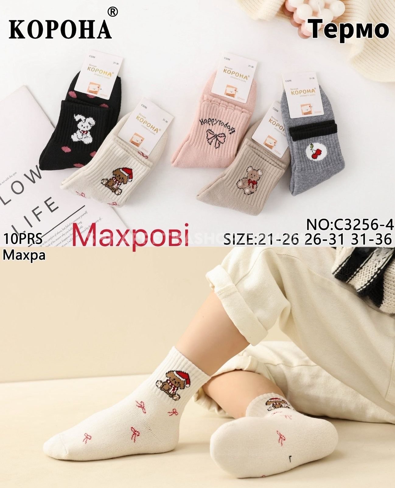 Шкарпетки "КОРОНА" С-3256-4 махрові дитячі на розмір взуття: р. 21-26, 26-31, 31-36 -асорті -(Дівчинка -мікс різних малюнків на широкій резинці в рубчик) -уп. 10 шт