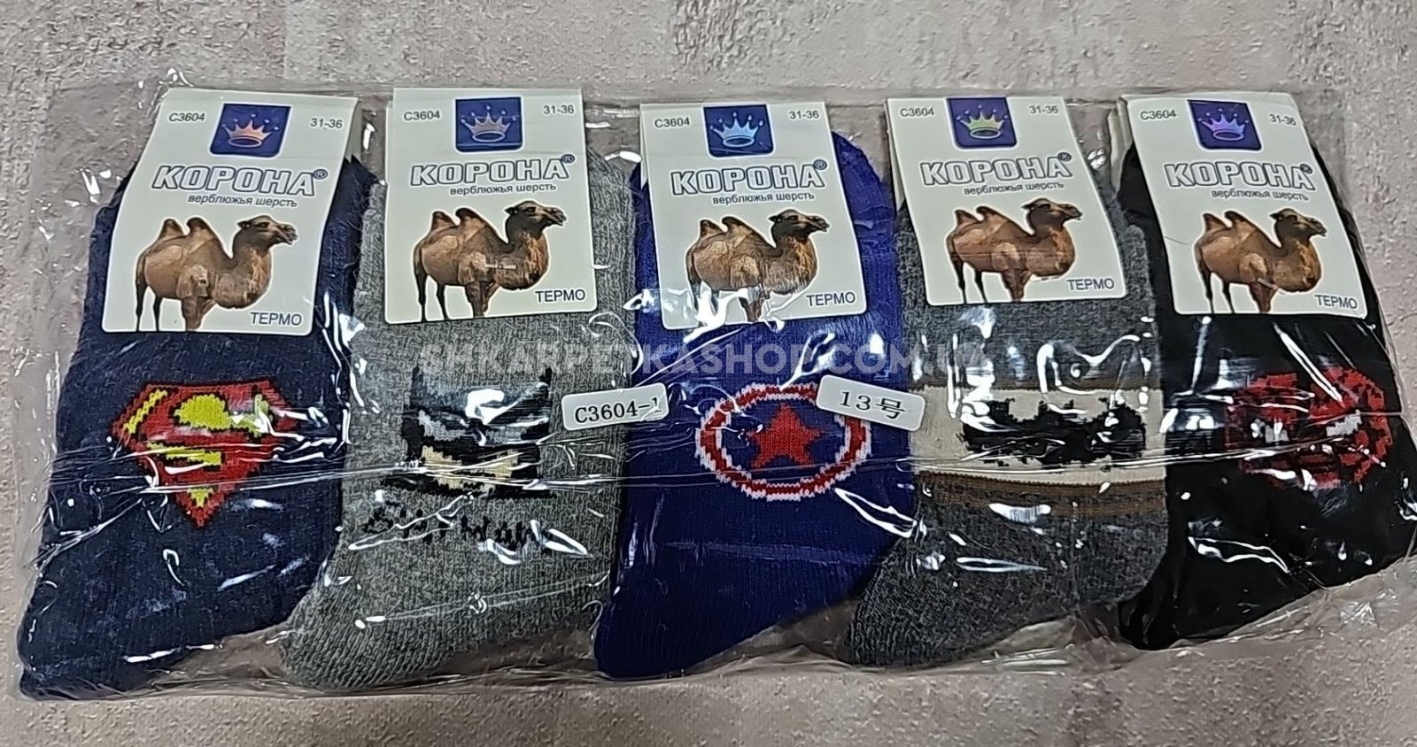 Шкарпетки "КОРОНА" С-3604-1 термо верблюжа вовна підліткові, р. 31-36 -асорті -(однотонні + збоку мікс героїв та значків -підліток) -уп. 10 шт