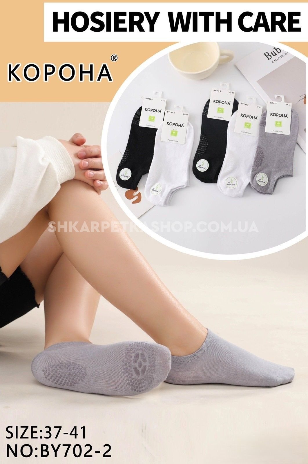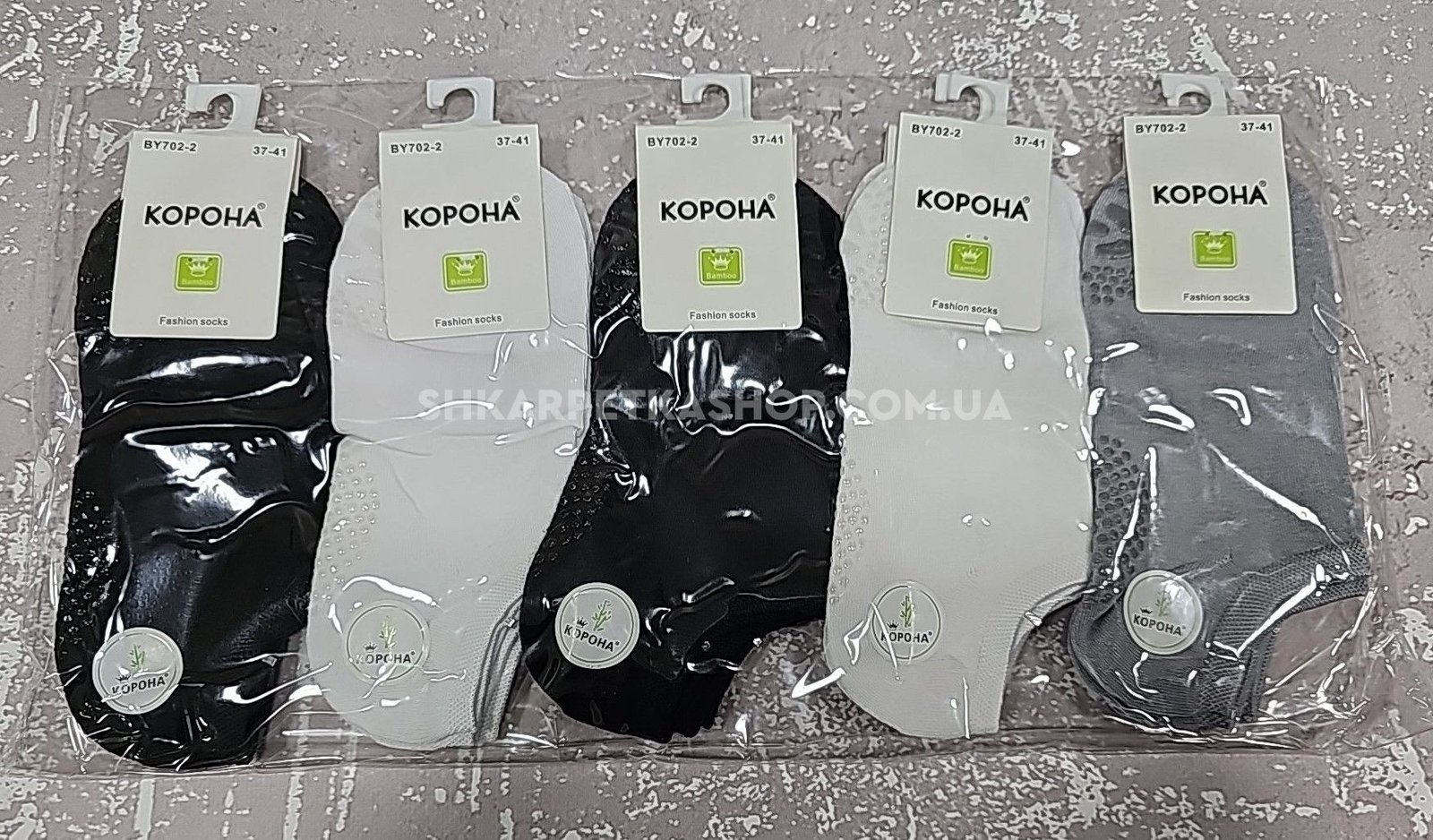 Шкарпетки "Корона" ВY-702-2 стрейч /бамбук з гальмами на стопі жіночі, р. 37-41 -асорті -(Сірі /білі /чорні -ультракороткі з силіконовими гальмами стопі) -уп. 10 шт
