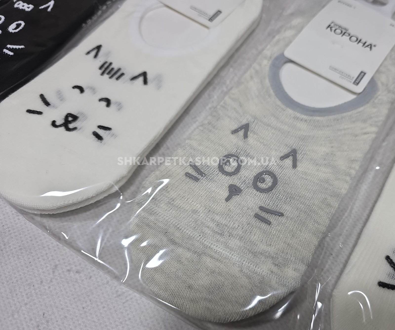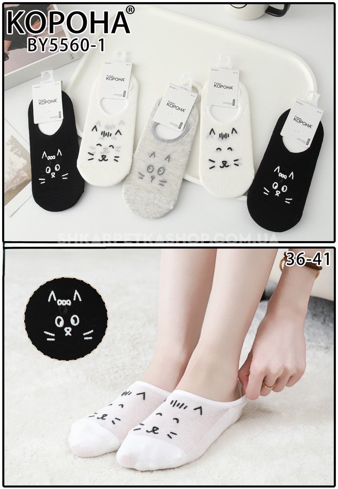 Шкарпетки-сліди "Корона" BY-5560-1 стрейч/ cotton жіночі із силіконом на п'яті, р. 36-41 -асорті -(Сліди /однотонні -спереду в дрібний рубчик +мордочка котика) -уп. 10 шт