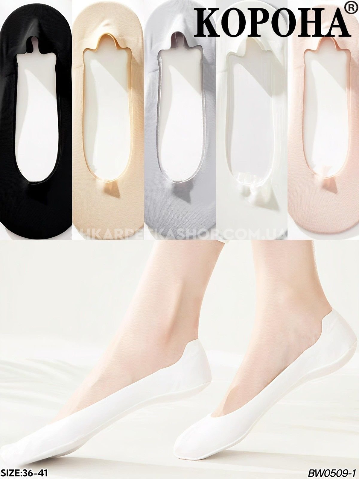Шкарпетки-сліди "Корона" WB-0509-1 жіночі "човники" з лазерної мікрофібри та бавовняною стопою з гальмами +з силіконом на п'яті, р. 36-41 -асорті -(однотонні /гладкі підслідники) -уп. 10 шт