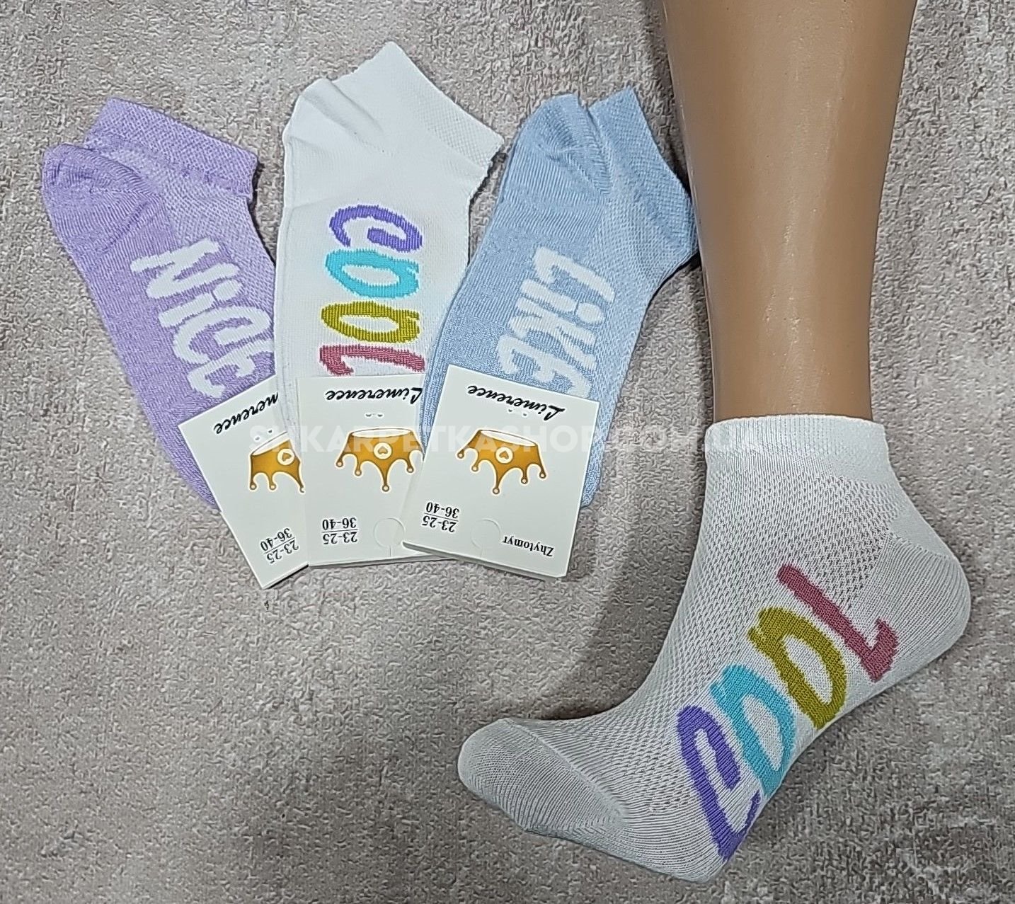Шкарпетки Житомир "Limerence" 03-50 сітка жіночі короткі, р. 36-40 -асорті -(сіточка -однотонні + збоку написи COOL +NICE +LiKE) -уп. 12 шт