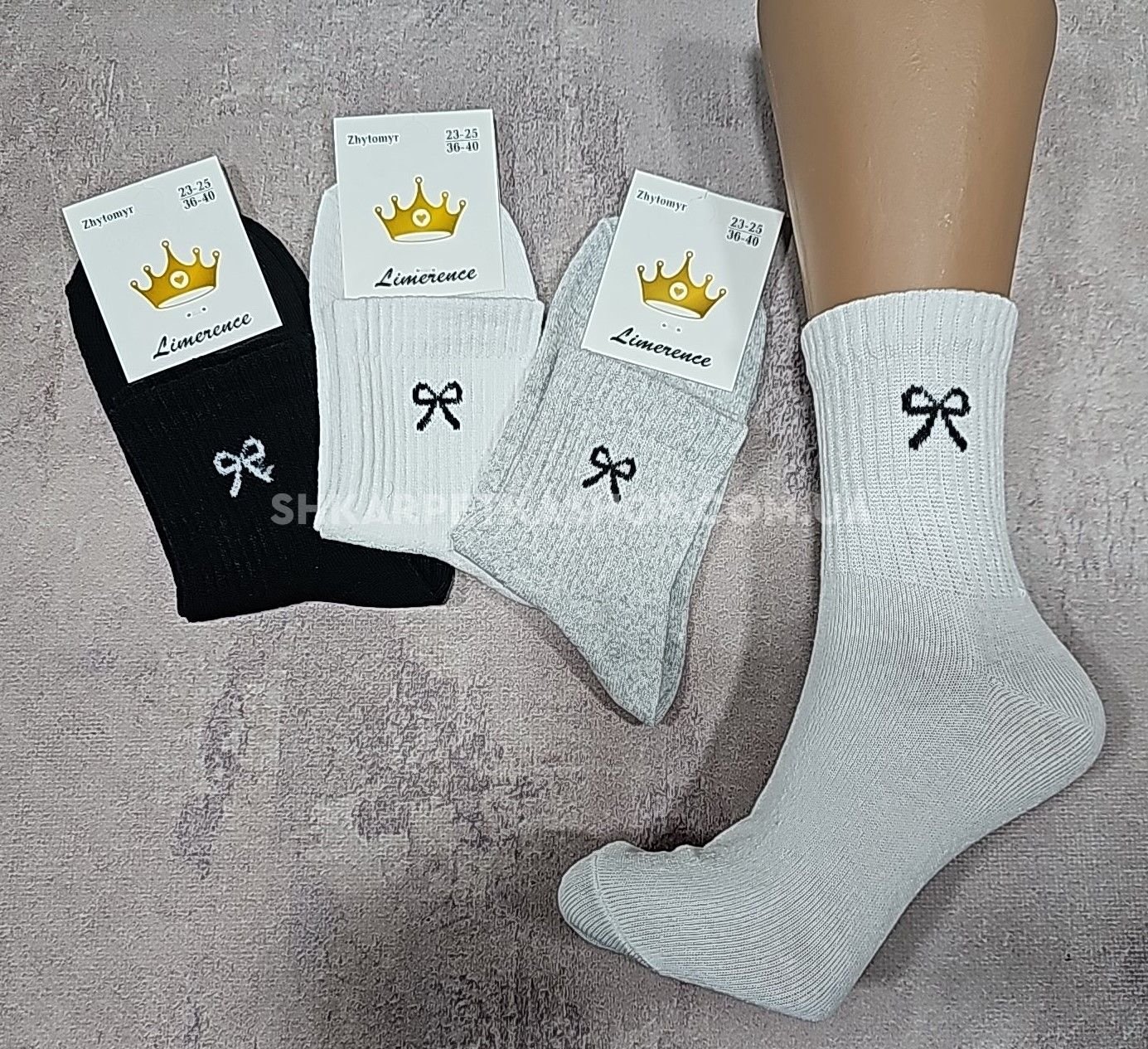 Шкарпетки житомир "LIMERENCE" 422-18 стрейч жіночі "Теніс середні", р. 36-40 -асорті -(середні-теніс /сірі, білі, чорні +збоку чорний бантик на широкій резинці в рубчик -стрейч)
