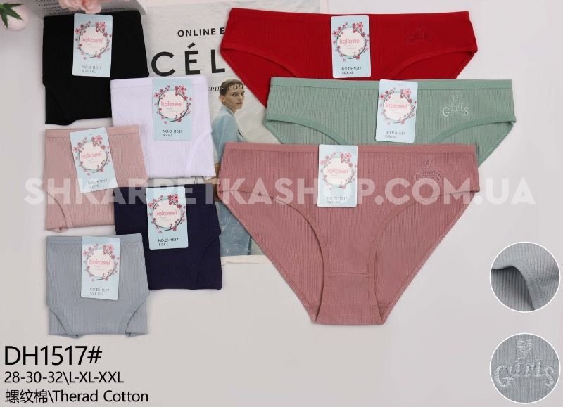 Жіночі труси "Kokowei" 1517 cotton, р. L, XL, 2XL -(44, 46, 48) -асорті -(Однотонні в рубчик +збоку написи Girls) -уп. 12 шт